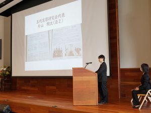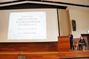 荒川学長・岡本同窓会会長の挨拶のあと、「五代友厚とともに」と題して3つの発表があった。