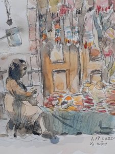 初めてのスケッチ。(ショールを並べて売っている老婦人)