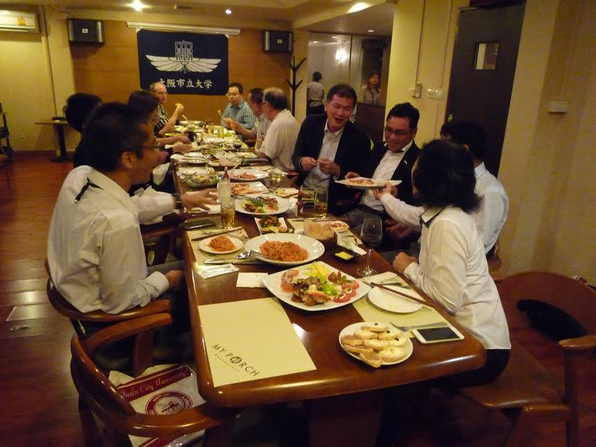 バンコクには、昨年から国立チュラロンコン大学内に、大阪市立大学バンコク拠点が開設されていることもあり、3月3日に当時の学長もご参加で開催された開設記念レセプションに引き続いての、今年2度目の公式行事となりました。今回は、井上徹副学長と国際センターのCorine様が本学からご訪泰。また、バンコク事務所スタッフ2名とチュラロンコン大学教授、タイ人の卒業生を交えての日本語と英語の飛び交うにぎやかな会となりました。