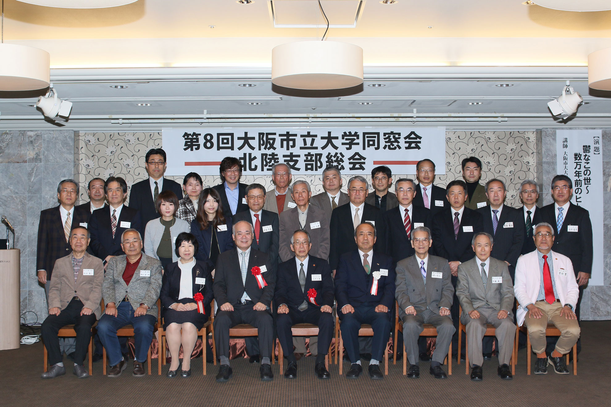第8回北陸支部同窓会総会・講演会が来賓(荒川学長、牧野同窓会副会長、白田同窓会副会長)と会員27名にてザ・グランユアーズフクイにて開催されました。講演会には新人支部会員でもある平澤栄次氏(昭和54年市大に奉職、現在大阪市大大学院理学研究科特任教授)を迎え「鬱なこの世~数万年前のヒトの脳が抱える悩み」を演題にご講演いただきました。