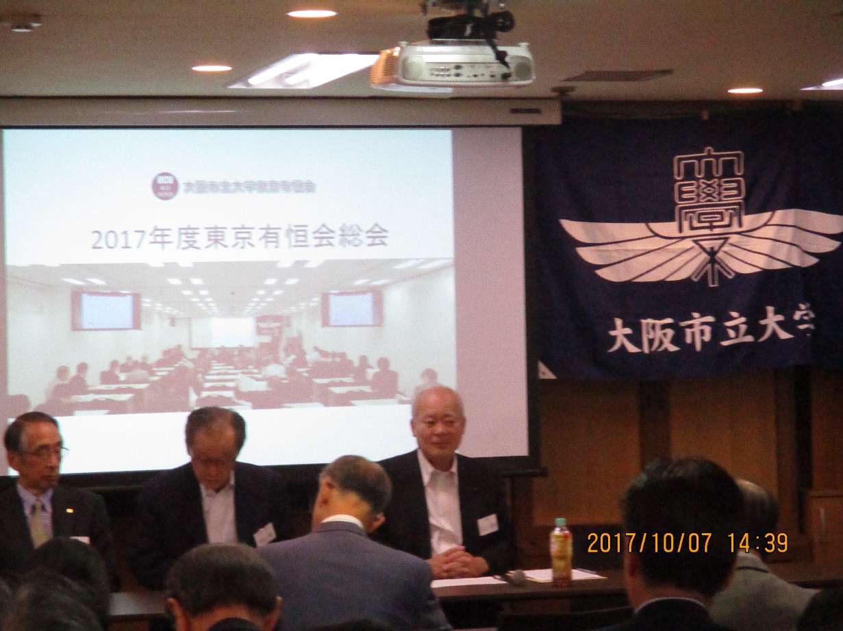 新設大学につきましては、大きな飛躍を目指す大学の設立構想が第一であり、現在の大学予算の制約は論外であり、新大学の土地取得、大学施設の設立費用は勿論、運営費についても新大学運営に相応しい、予算を確保するために、市や府との折衝に厳しい姿勢(侍精神)で臨んでいくとの心強いお話でした。荒川学長への参加者の質問に対しても丁寧にご回答を頂き、参加者にもご満足を頂けたと思っております。特に、新設大学の構想、大学のネームバリューを挙げるためにも、大学の東京事務所の設立、大学のランキングを上げるための方針、大阪市の健康問題への取り組みなどが参加者の興味を引くところであったと思います。