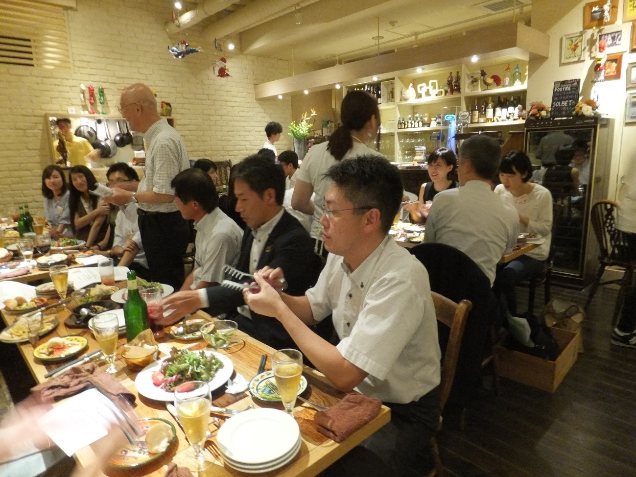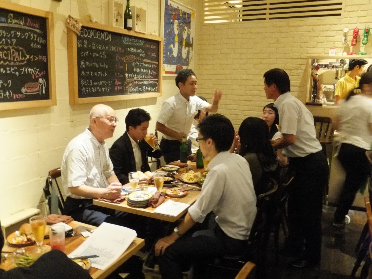 例年若手だけに声かけて開催していましたが、今回は若い人達が主役ながら先輩達にも集ってもらい、おいしい西班牙料理に冷たいビールを手に鋭気を養い、あるいは議論をしながら楽しいひとときを過ごすことができればと趣向を変えました。