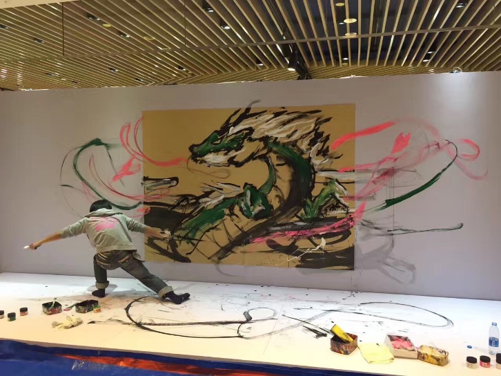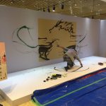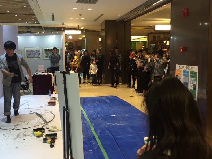 音楽に合わせてステージにて絵を描くパフォーマンス、ライブアートは晩御飯時の人の集まりやすい時間に行いました。その甲斐もあって、音楽が鳴り始めると多くの方が見に来られ、お店の中からガラス越しに見ている方も多くいらしゃいました。15分という短い時間でしたが、多くのお客様に楽しんでいただけました。