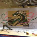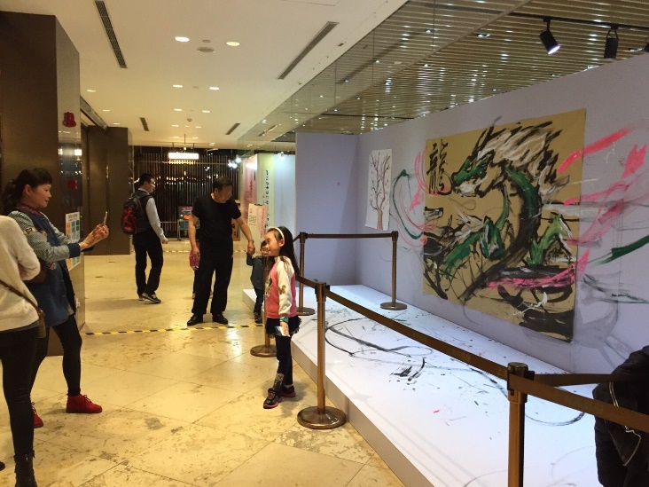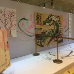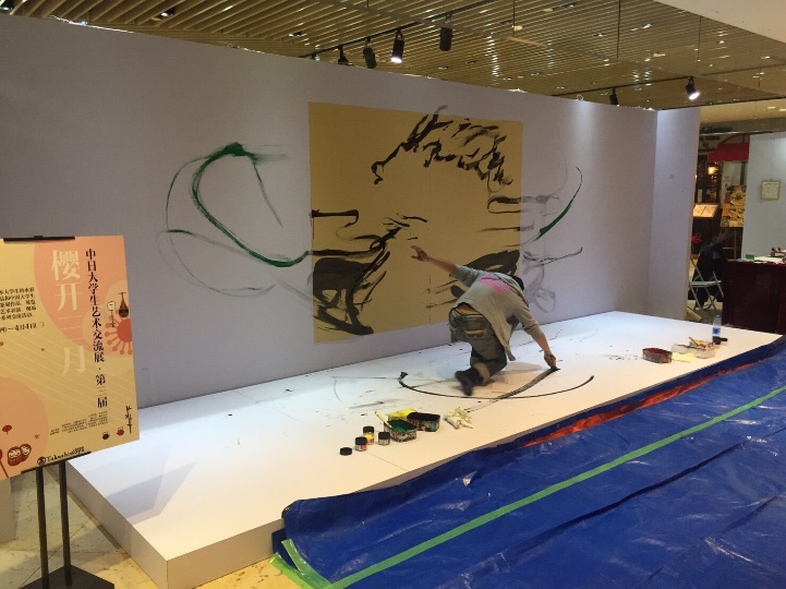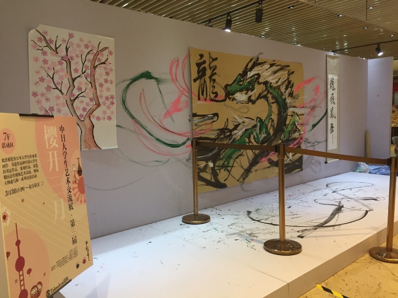高島屋の「桜フェア」に合わせた絵と上海大学の書道を加えた作品が出来上がり、その日以降に訪れたお客様が作品の前で記念撮影を行う様子も多く見られました。