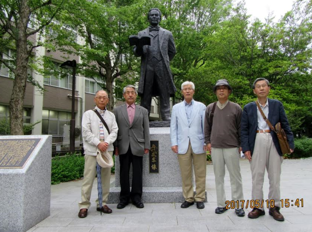 ◆ 5月10日に幹事が「有恒会」事務局を訪れた際、商学部棟の横に昨春建立された「五代友厚像」前にて撮影。左から岡田貞夫・前島浩・板垣幸男・大塚弘文・柳原仁彦(敬称略)