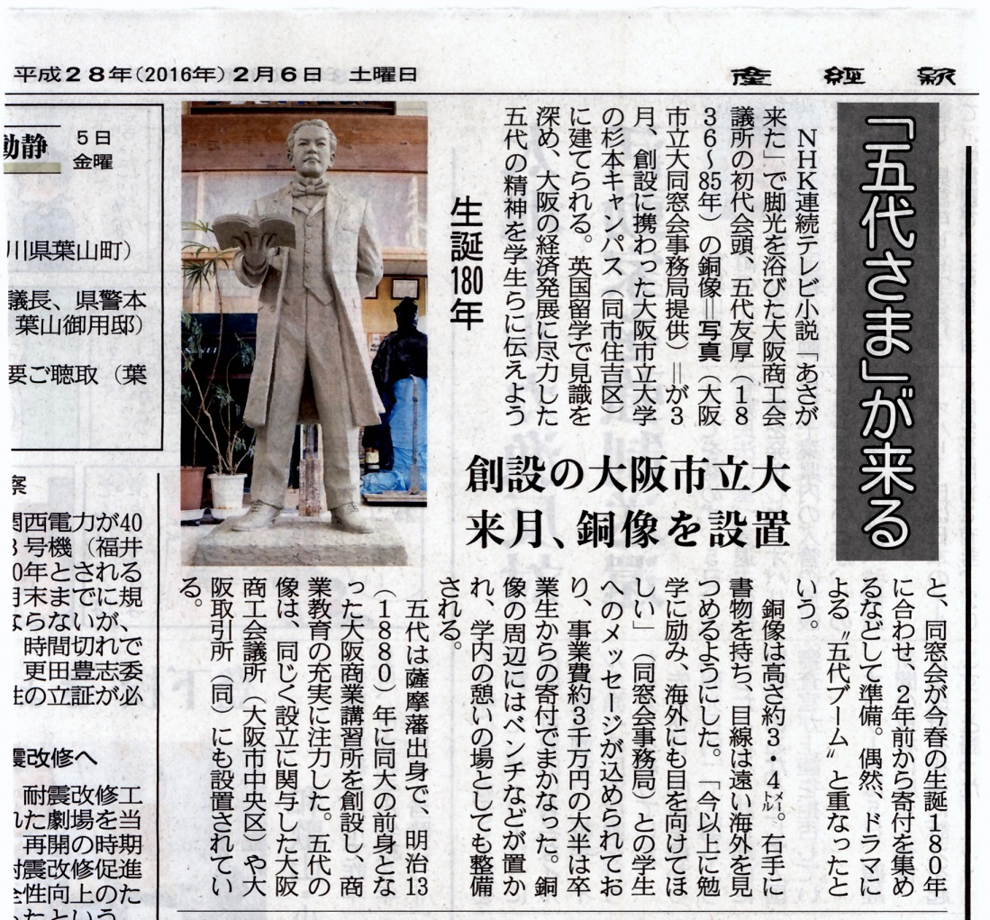 上記に関連し、サンケイ新聞(2/6朝刊・大阪版)に五代友厚銅像建立について