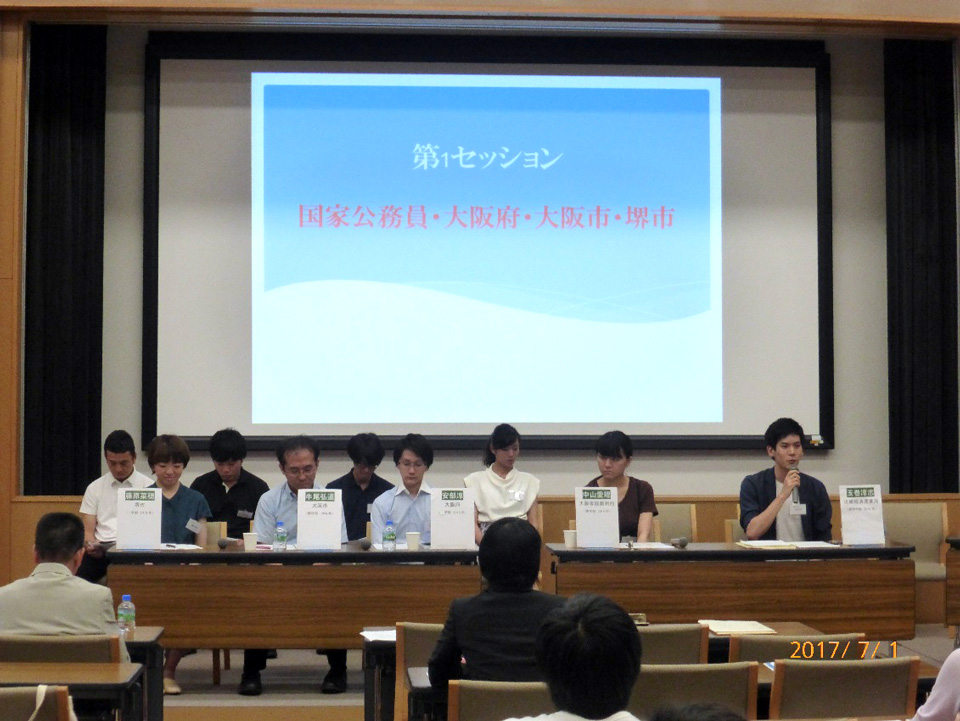 7月1日(土)13時30分より学術情報総合センター10階大会議室で開催。近畿圏の8自治体(大阪府、大阪市、堺市、兵庫県、神戸市、京都市、奈良県、和歌山県)勤務と国家公務員(近畿経済産業局、大阪家庭裁判所)の市大OBOG20名がパネリスト・助言者として参加。この内、受講者として本交流会に以前参加の4名が、今度は講師の立場で後輩のために出席してくれました。