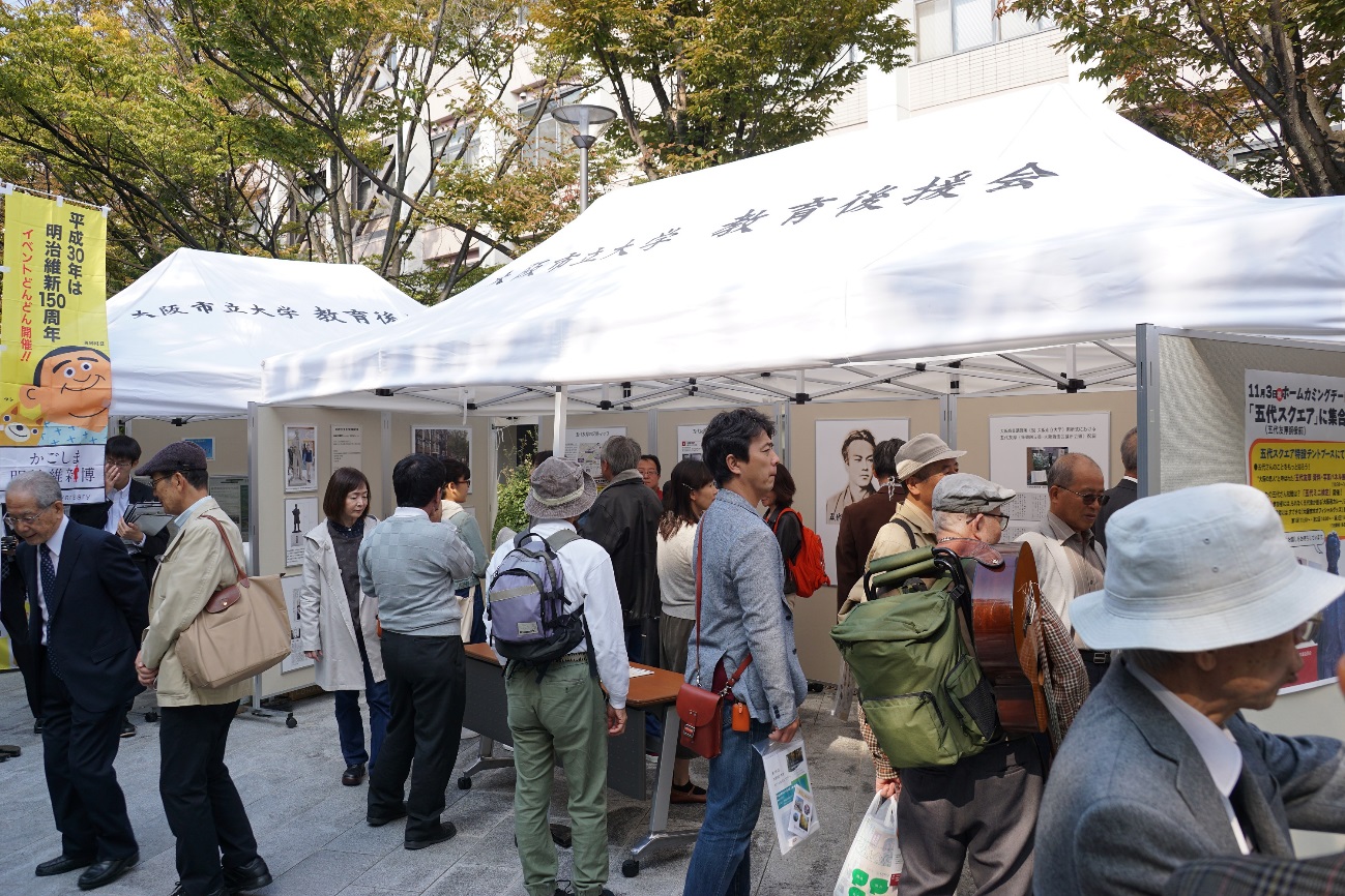 今年は五代友厚関連イベントとして、五代友厚の足跡を辿るパネル展示と五代検定が実施された。キャンパスツアーの終着点に五代スクエアが設定され、多くの卒業生が五代検定に挑戦した。会場では高得点を目指し、展示を隈なく見て学習する参加者の姿が多く見られた。参加者には参加賞として大阪港開港150周年を記念したカレーが、高得点者には本学グッズの一つであるクッキーが授与された。また、五代展示の隣では鹿児島県大阪事務所が「五代友厚&明治維新150周年をメインにした鹿児島県観光」のPRを行った。2018年大河ドラマ「西郷どん」にちなみ西郷隆盛の等身大パネルが五代像の前に設置され、訪れた人々は五代友厚、西郷隆盛との写真撮影を楽しんでいた。また、「友厚」や「西郷隆盛」といった銘柄の焼酎が振る舞われ、多くの人が試飲していた。