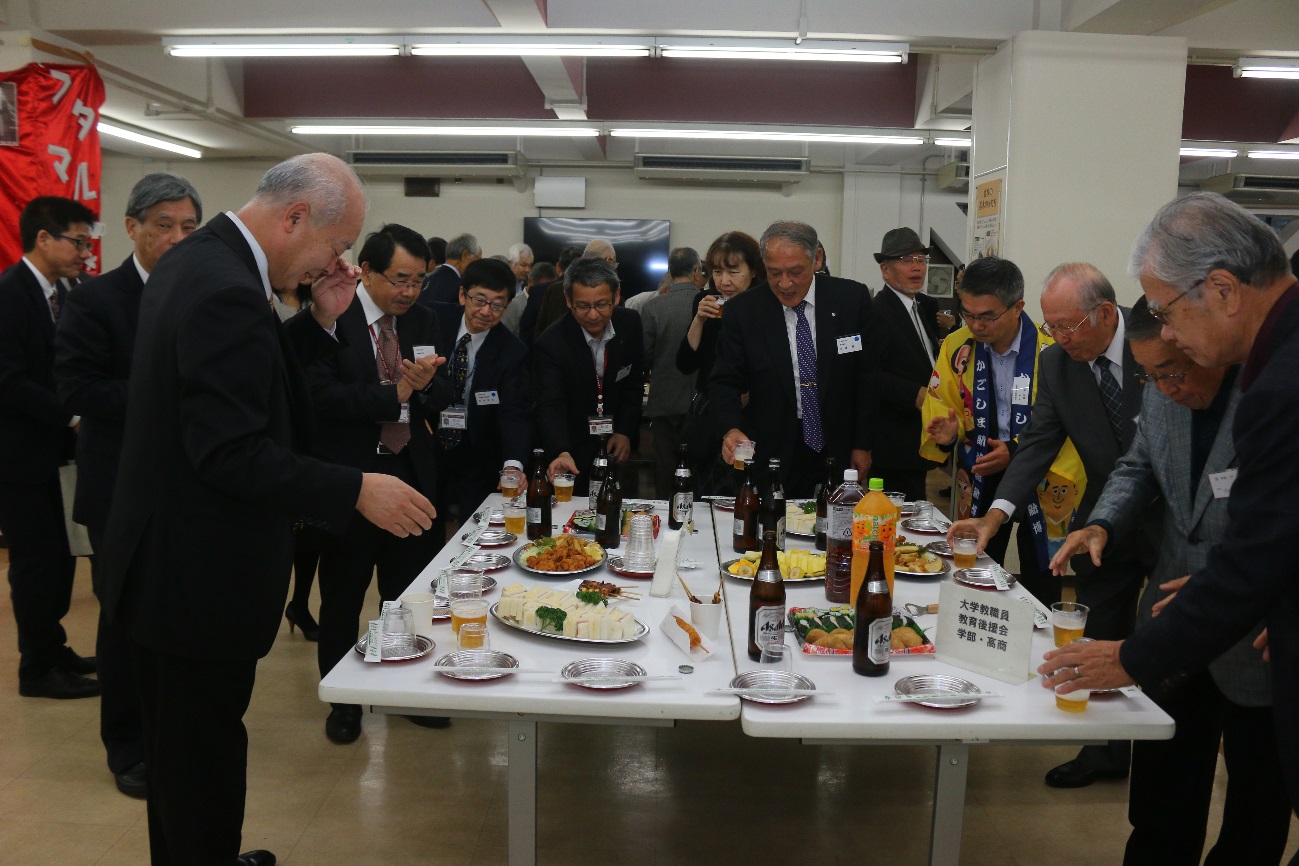 午後4時30分からは旧教養地区北食堂で、学長主催ウェルカムパーティーが開かれた。学長は挨拶で硬式野球部の秋季リーグ優勝など運動部の活躍を称え、またプロボクサー・坂本真宏選手を紹介し、次戦に向けて卒業生の応援を呼び掛けた。会場は再会を喜び合う同窓生たちの和やかな雰囲気に包まれた。パーティーの最後には逍遥歌の合唱が行われ、同窓生たちの歌声とともに今年のホームカミングデーは幕を閉じた。