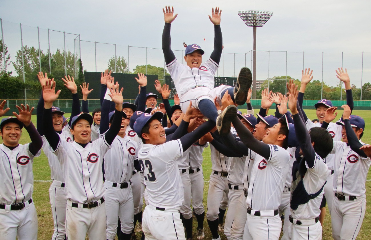 硬式野球部は昭和63年以降、高校の課外活動の実績を加味する経済学部の「ユニーク選抜(一芸入試)」の効果で甲子園経験者や力のある選手が続々と入部するようになり、平成4年秋、5年秋と2度リーグ優勝を果たしました。その後、優勝から遠ざかっていましたが、平成22年に就任した辻盛監督の積極的な攻撃野球が、8年目で大きく開花しました。