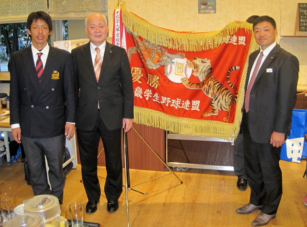 優勝旗と荒川学長を中心に左は土井主将、右は辻盛監督