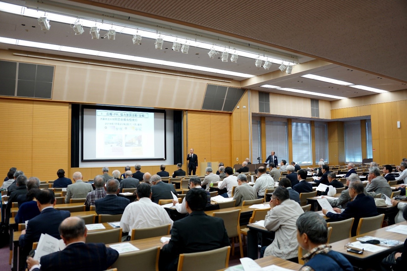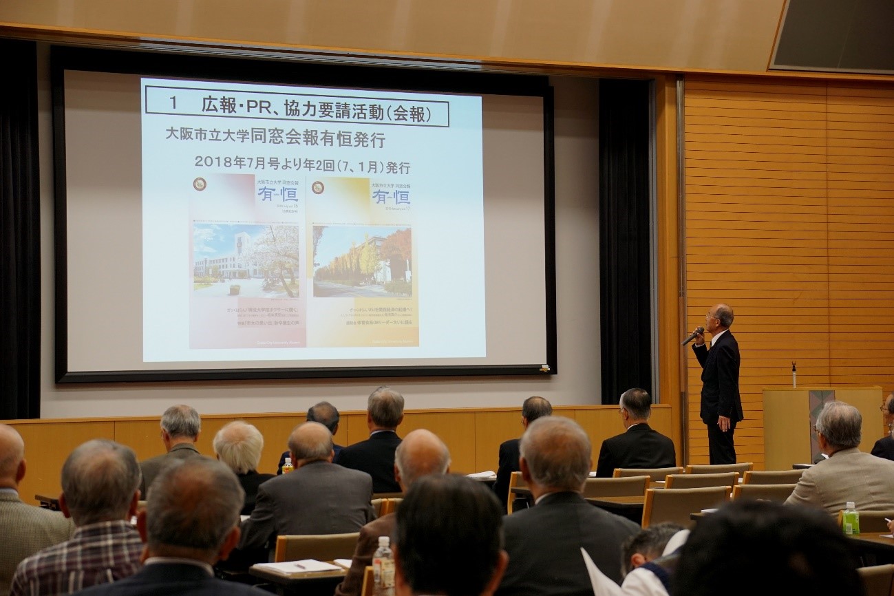 大阪市立大学同窓会定期総会が11月3日14時よりホームカミングデーと併せて開催された。初めに児玉隆夫会長より挨拶があり、その後議事が行われた。議事では全学同窓会における活動報告や決算報告、計画案、予算案、組織改編、会則改訂等の審議・採決がスライドを通して行われた。
