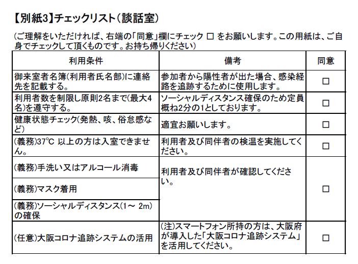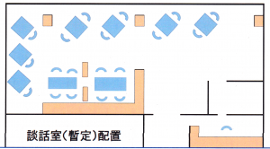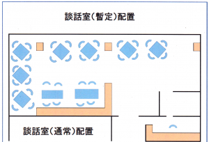 談話室の現行の「定員36名」を3密を避けるため「暫定定員19名」(概ね2分の1)を設ける。