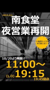 [告知 10/20(土)より南食堂夜営業再開11:00~19:45(19:45閉店)