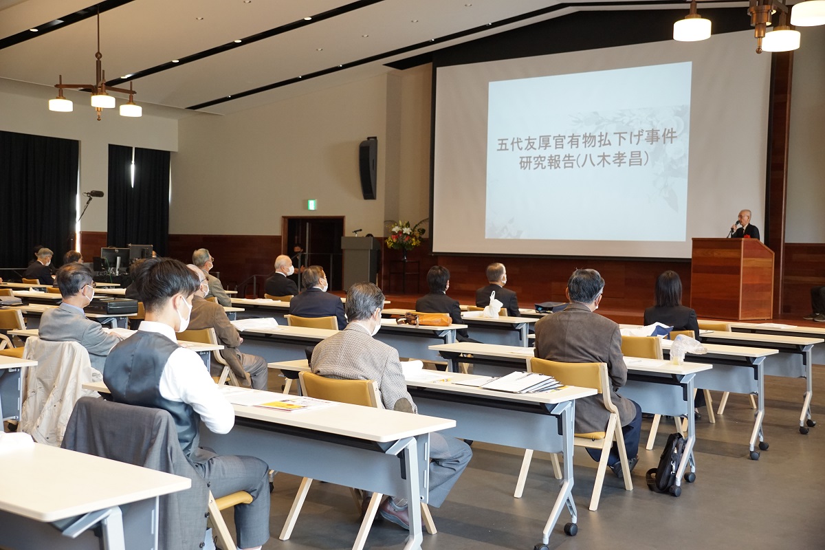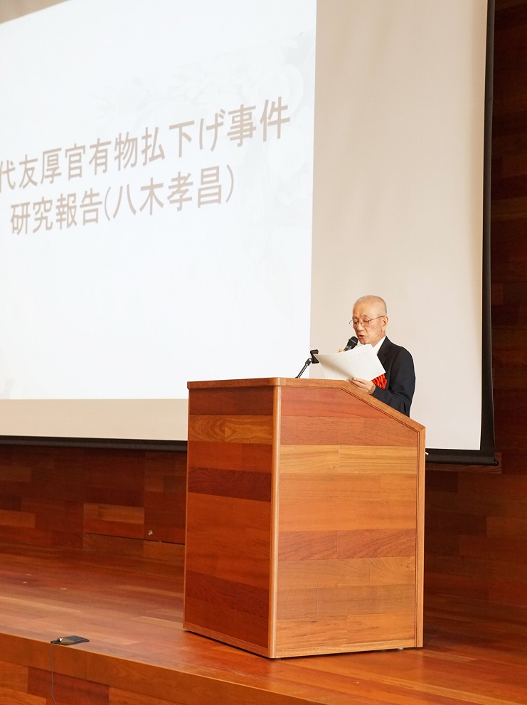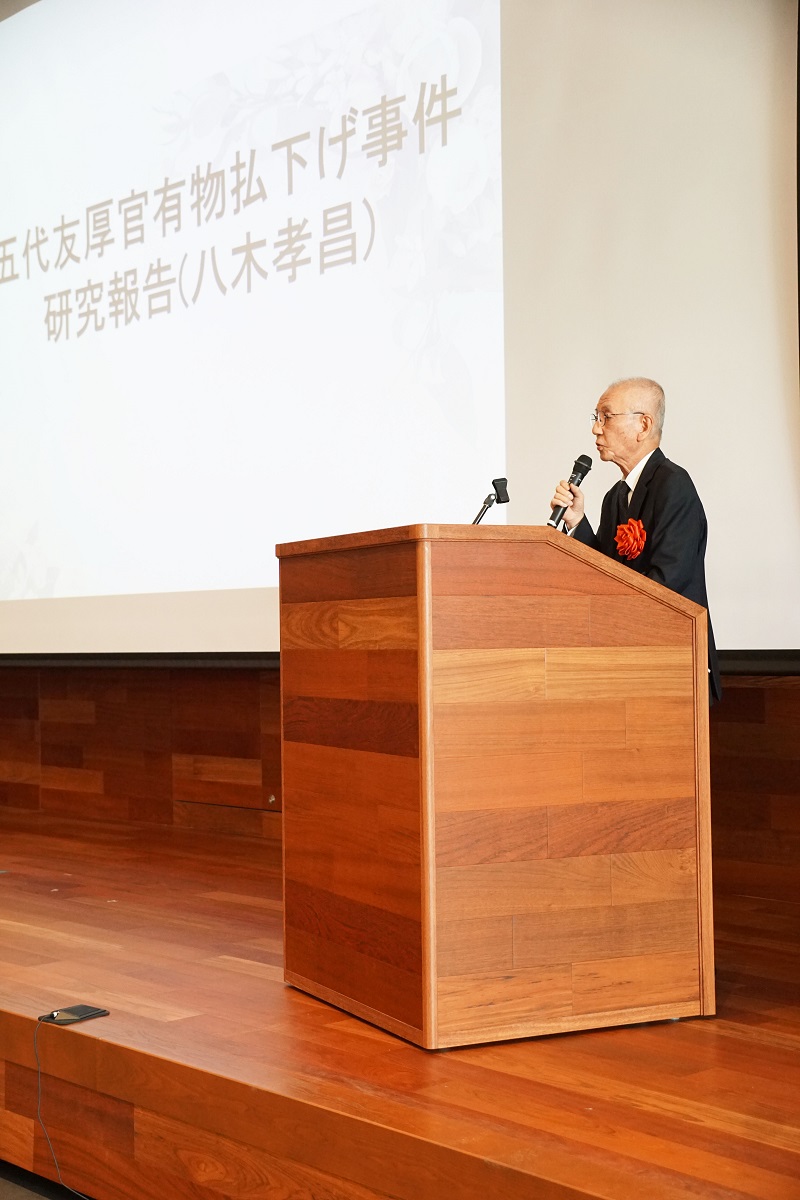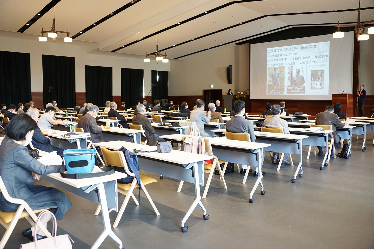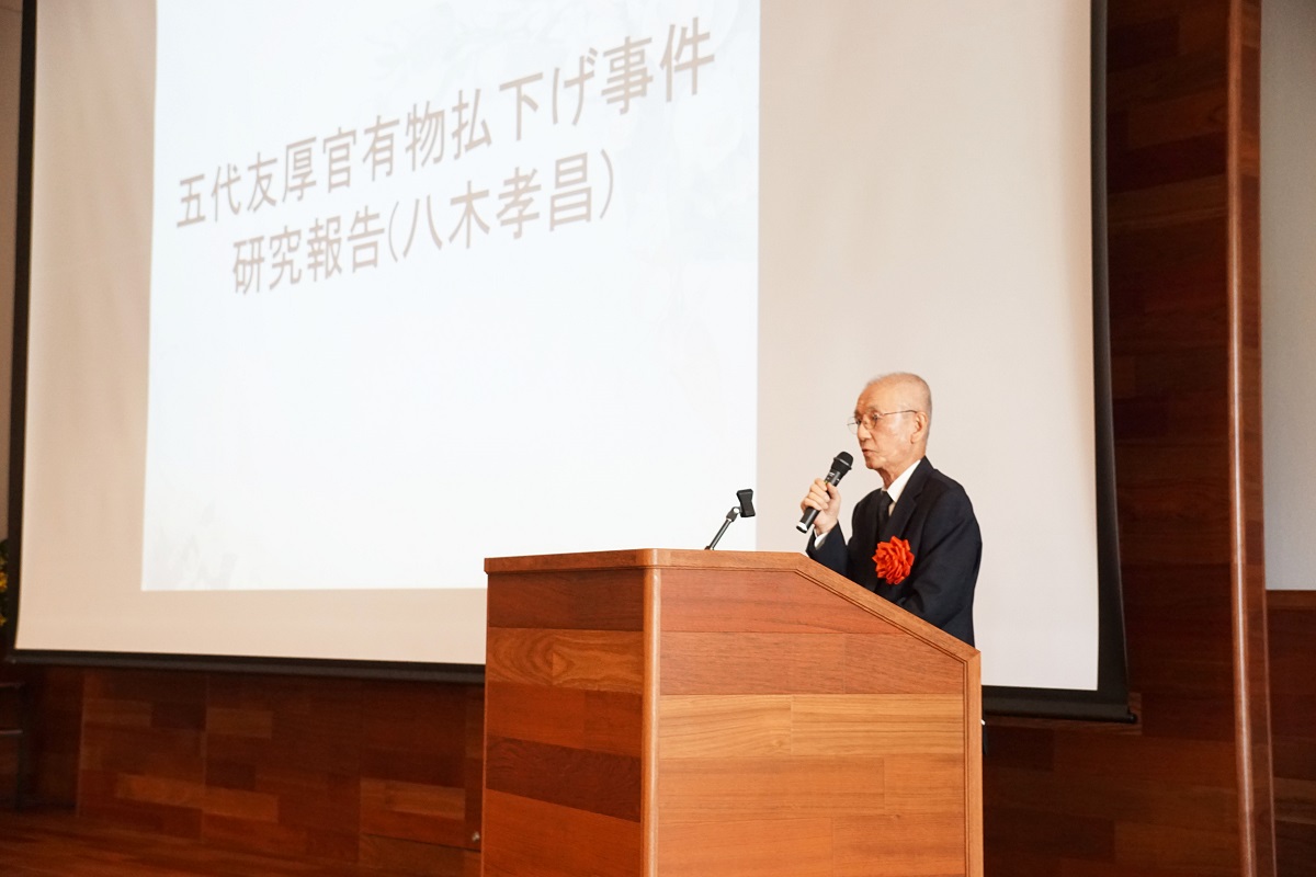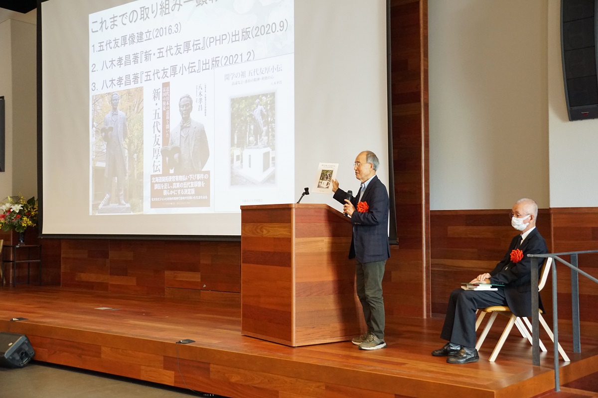 荒川学長・岡本同窓会会長の挨拶のあと、「五代友厚とともに」と題して3つの発表があった。