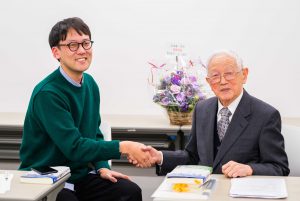 宮本憲一名誉教授(右)と、経済学部の斎藤幸平准教授(左)