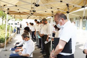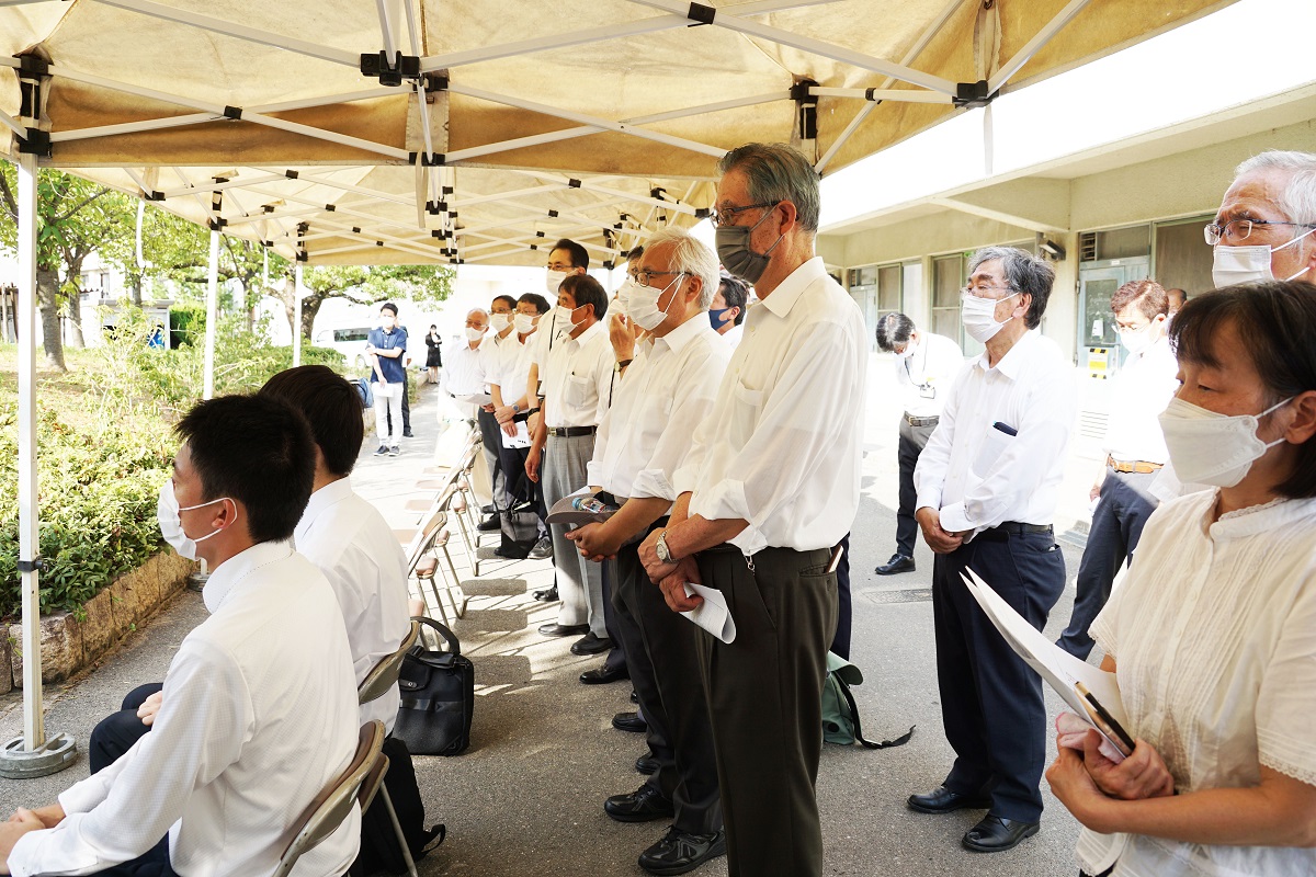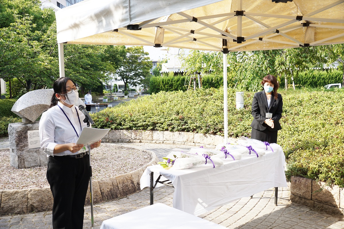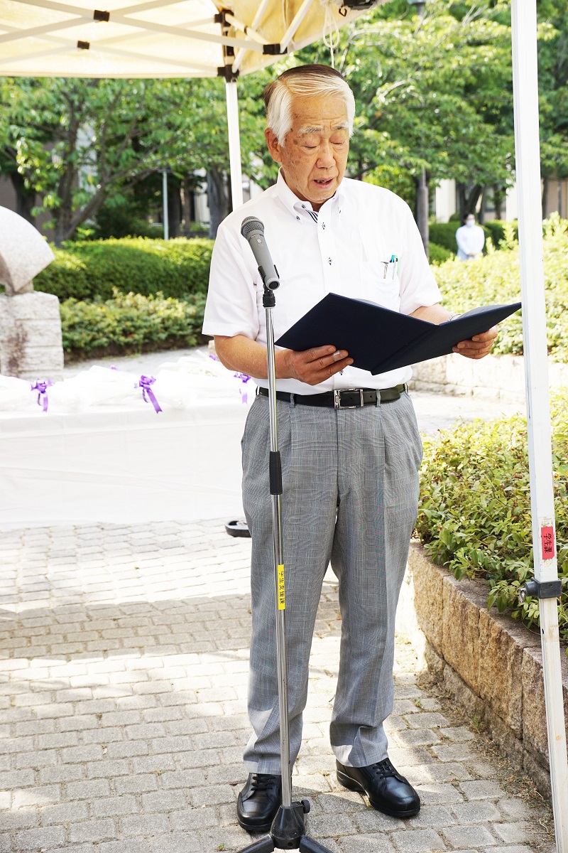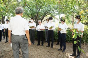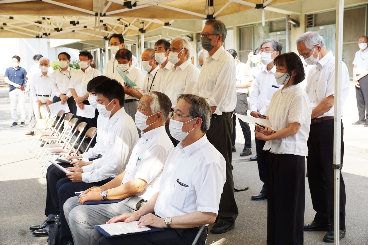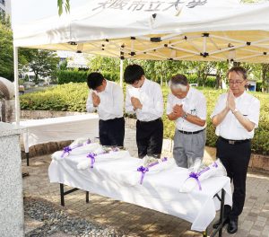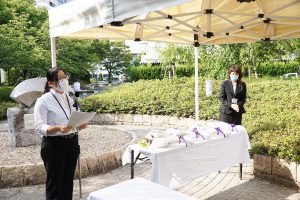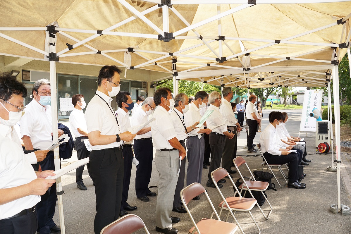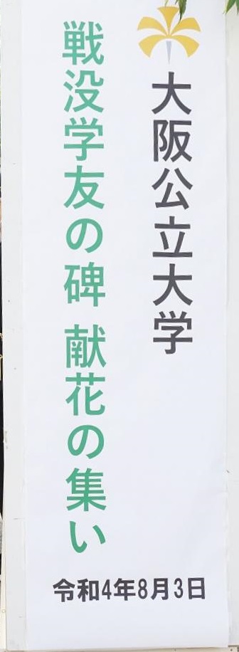 平成14年4月の碑建立以来、桜花爛漫の4月上旬に「戦没学友の碑 献花の集い」が開催されていたが、14回目となる本年は、コロナ禍・猛暑の中であったが、広島・長崎での平和記念式典に先立ち8月3日に大阪公立大学・大阪市立大学同窓会共催で開催した。コロナ禍・猛暑を鑑み、戦没学友遺族、碑建立発起人、発起人家族の方々には参列をお控えいただき、同窓生及び
