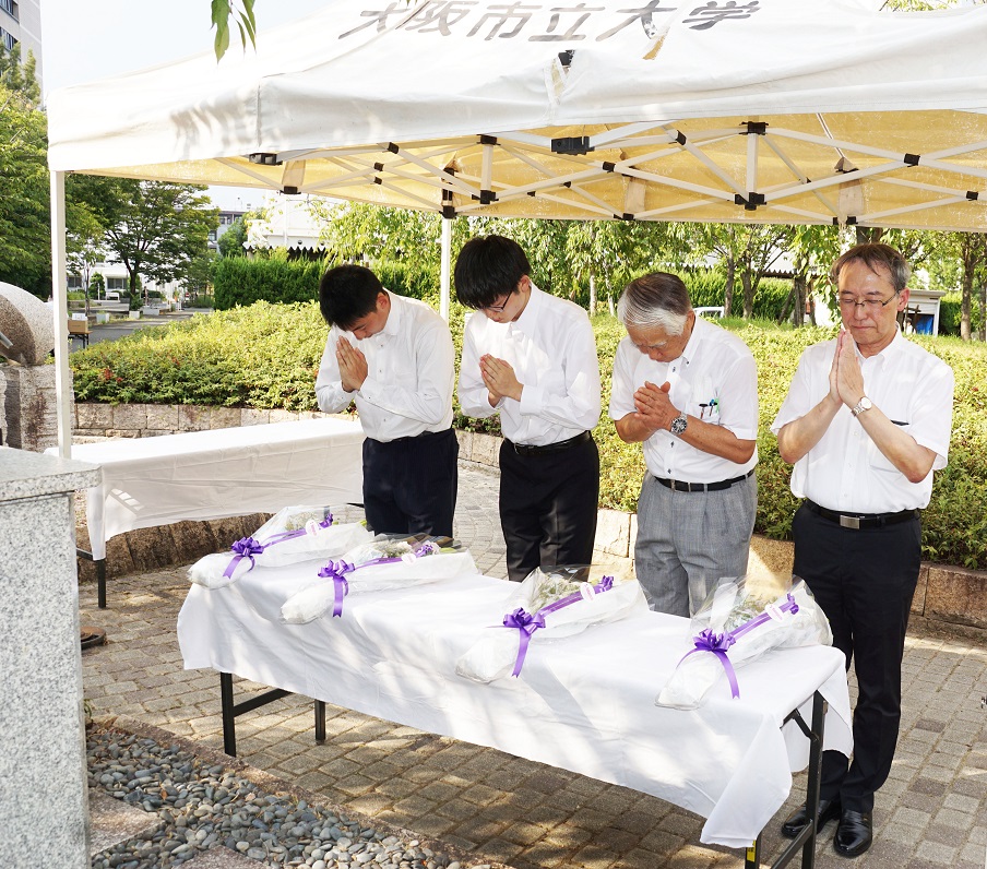 開催に先だって、大阪公立大学グリークラブ、南澪会(市大グリークラブOB会)21名による「學園(まなびや)」(1940年、大阪商科大学創立60周年を祝して創作。作詞は大阪商科大学合唱団の金子仁作氏)を献歌した。辰巳砂学長、岡本会長挨拶後に、参列者を代表して学長、会長、学生代表2名により戦没学友の碑に花束を献花し、参列者は黙とうを捧げて平和を祈念した。