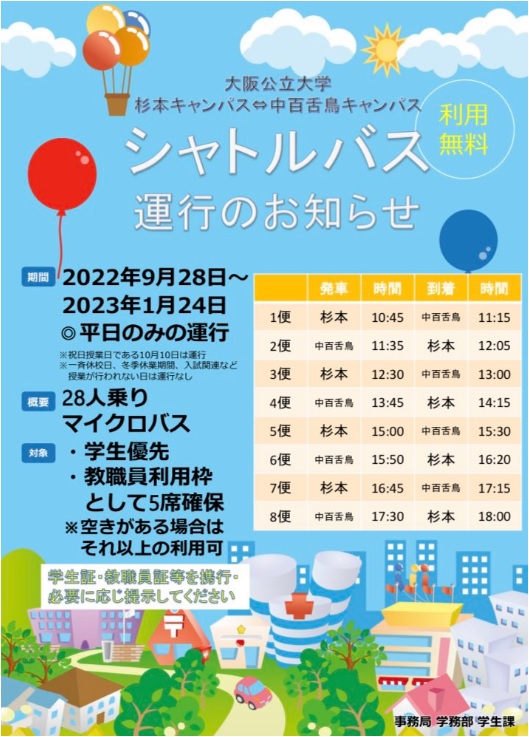 [バス] 杉本⇔中百舌鳥 シャトルバス運行 (出典:大阪公立大学)