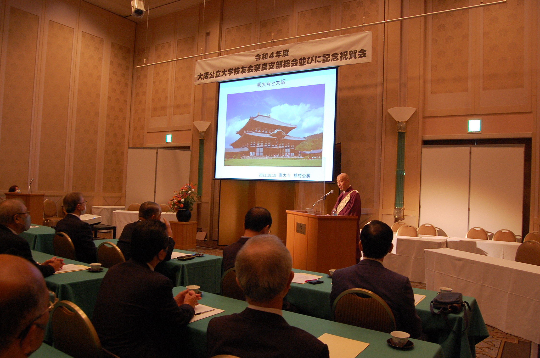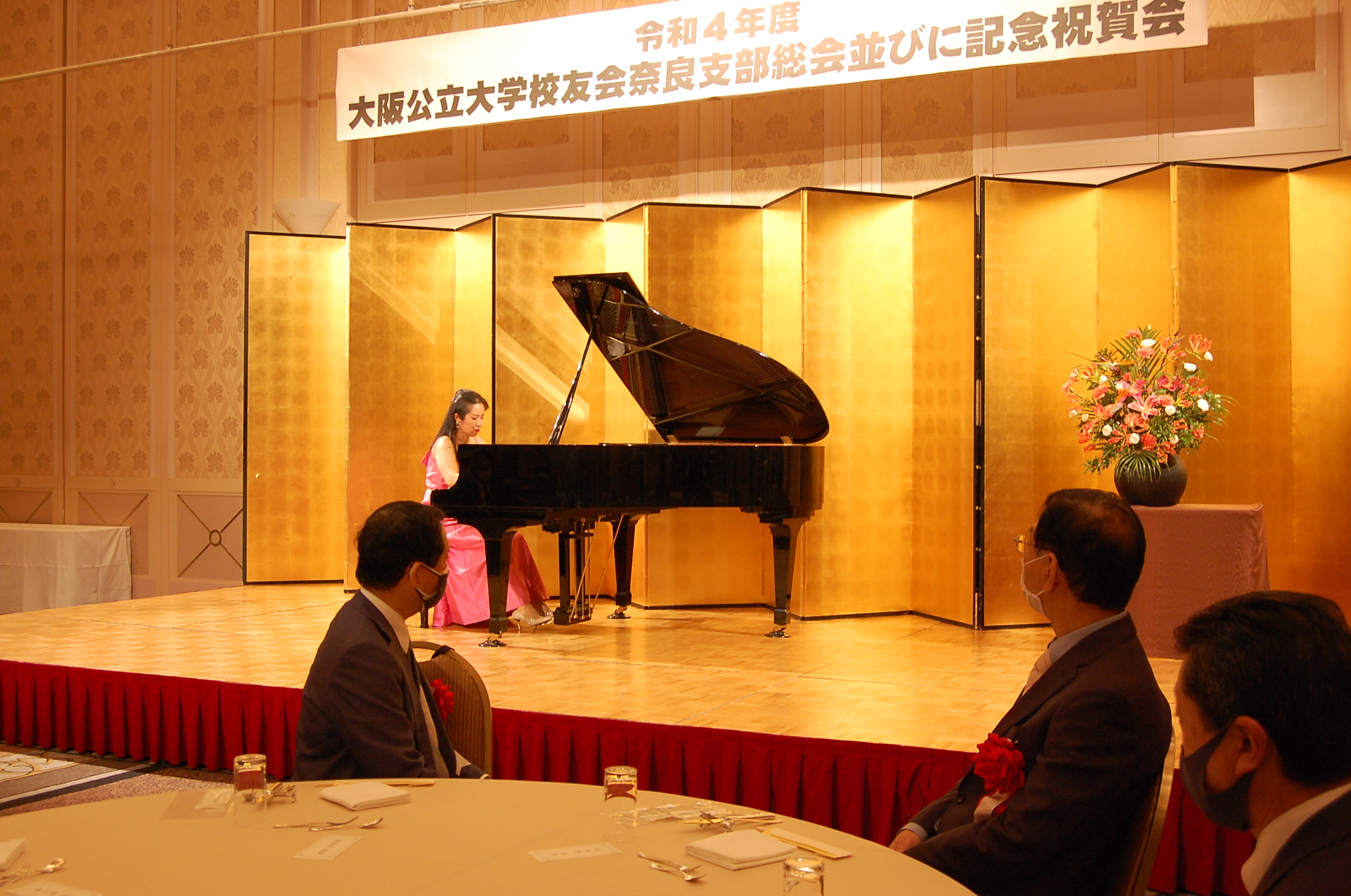 引き続き記念講演が行われ、昭和54年、大阪市立大学文学部卒業の橋村公英・東大寺224世別当が「東大寺と大阪」をテーマに講話。記念祝賀会では市大卒業生で新世紀美術協会会員の原田利明氏の作品展示、三木正義氏企画の三木康子氏(奈良県音楽芸術協会顧問)のピアノ演奏などが披露されました。