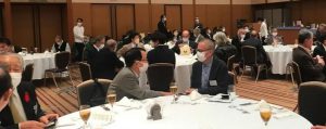 懇親会の乾杯のご挨拶は有恒会副会長 小林俊介様。有恒会が統合同窓会となることの嬉しいご報告も。