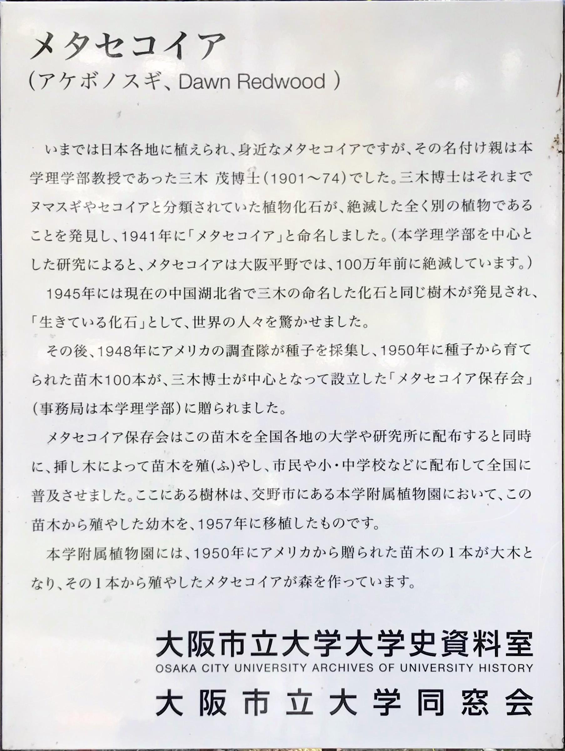 メタセコイア(あけぼのすぎ)は、もと本学(大阪市立大学)理学部教授、故 三木 茂 博士が第三紀植物遺体から昭和16年に命名された植物である。