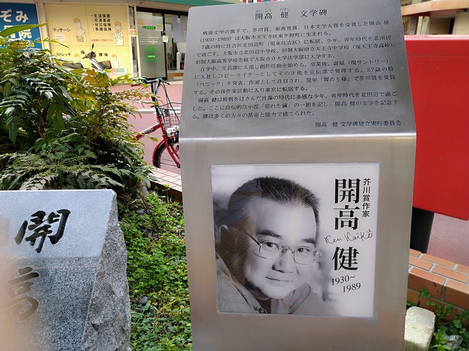 開高健文学碑は北田辺で育った大阪市立大学卒で芥川賞等数々の文学賞受賞作家・開高健を顕彰し、2005年(H17)11月5日、 同窓生、開高ファン等有志の募金により、近鉄北田辺駅前に建立されました。