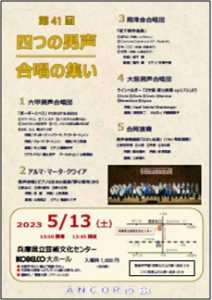 - 2023.03.07 [イベント案内] 5/13(土) 第41回四つの男声合唱の集い/兵庫県立芸術文化センター