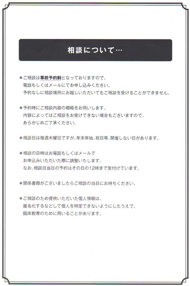 | 相談日時 | 毎週木曜日の午後3時~午後5時(祝日除く) |