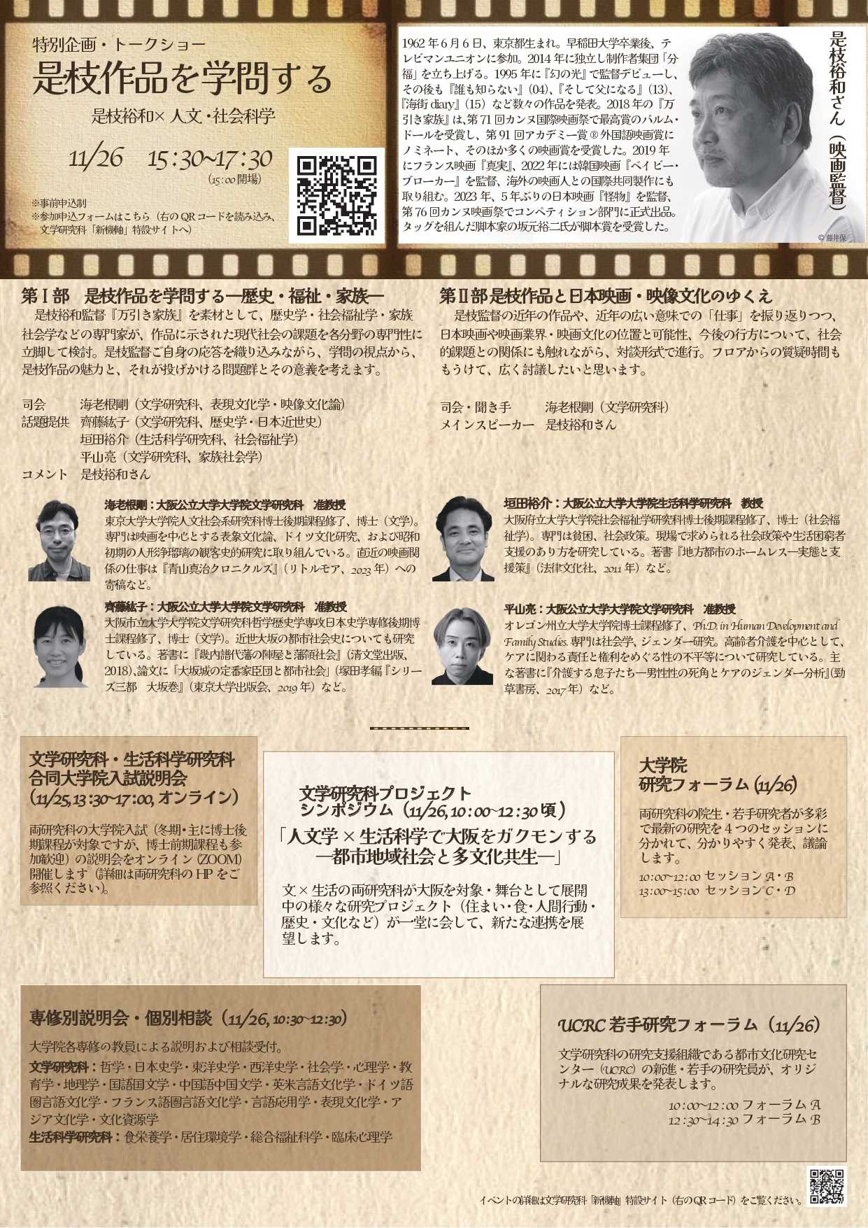 特別企画として11月26日に映画監督の是枝裕和氏をお迎えしたトークショー(要申込)をあべのハルカスにて開催します。