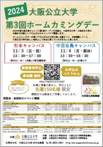 さて、2024年度 大阪公立大学第3回ホームカミングデーを、11月3日(日・祝)杉本キャンパス、11月4日(月・振休)中百舌鳥キャンパスにて開催致します。