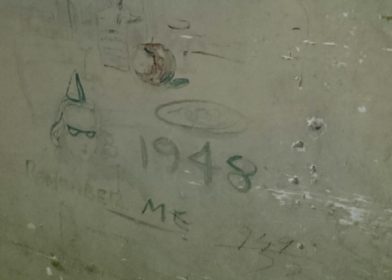 中に入り奥に進むと、その壁には看護師か女性兵と思われる女性の絵が描かれていた。このポンプ室が以前にどのように使用されていたかは不明だが、杉本学舎が病院や軍施設としての機能を持っていたことの痕跡であると思われる。その他にも英語でさまざまな落書きが残っており、確かにそこには占領軍がいたという証拠があった。