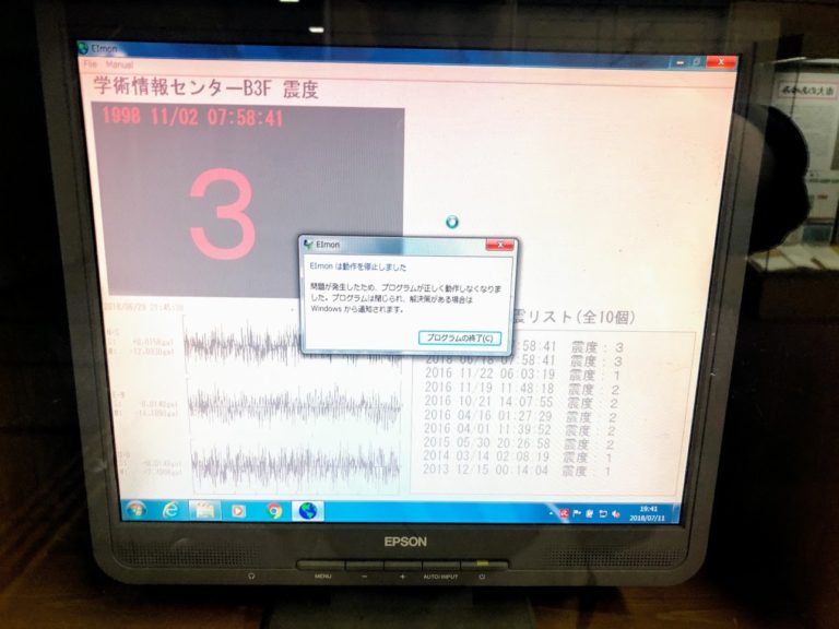 本学での震度を表示するコンピューター=学術情報総合センター1階で7月11日、松岡進之介撮影