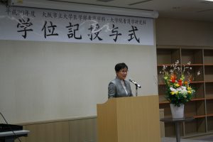 平成31年3月25日(月)に、大阪市中央体育館において平成30年度卒業式・学位記授与式を挙行されました。同日、午後からは看護学科学舎にて大学院看護学研究科・医学部看護学科 学位記授与式が行われ、医学部看護学科57名、看護学研究科前期博士課程4名、後期博士課程1名が学位記を授与されました。